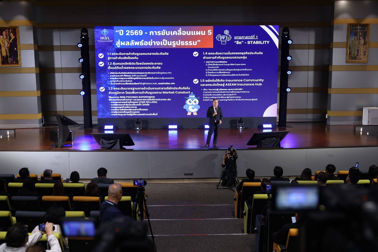 ประเด็นที่ 3 เสริมสร้างความรู้ด้านการประกันภัยให้แก่สื่อมวลชนและผู้สื่อสารสาธารณะ สำนักงาน คปภ. ให้ความสำคัญกับการพัฒนาเครือข่ายนักสื่อสารคุณภาพ เพื่อให้ประชาชนได้รับข้อมูลด้านการประกันภัยที่ถูกต้องและเชื่อถือได้ โดยต่อยอดโครงการ Responsible Voices สำหรับ Finfluencer ซึ่งที่ผ่านมาได้ดำเนินการแล้ว 2 รุ่น มีผู้เข้าร่วมรวม 87 คน และเข้าถึงประชาชนกว่า 34 ล้านคน พร้อมทั้งเตรียมจัดกิจกรรม Reunion และเปิดอบรมรุ่นที่ 3 ในปี 2569 ควบคู่กับการจัดหลักสูตรและ Workshop สำหรับสื่อมวลชนและผู้สื่อสารสาธารณะ เพื่อยกระดับความเข้าใจด้านประกันภัย กฎหมาย และบทบาทการกำกับดูแล นอกจากนี้ ยังได้เปิดตัว “น้องพิทักษ์ (PITAK)” มาสคอตประจำสำนักงาน คปภ. เพื่อเป็นตัวแทนในการสื่อสารข้อมูล ข่าวสาร และสิทธิประโยชน์ด้านการประกันภัยให้ประชาชนเข้าใจได้ง่าย เข้าถึงได้มากขึ้น และสามารถใช้ประกันภัยเป็นเครื่องมือในการ สร้างความมั่นคงทางการเงินได้อย่างมั่นใจ