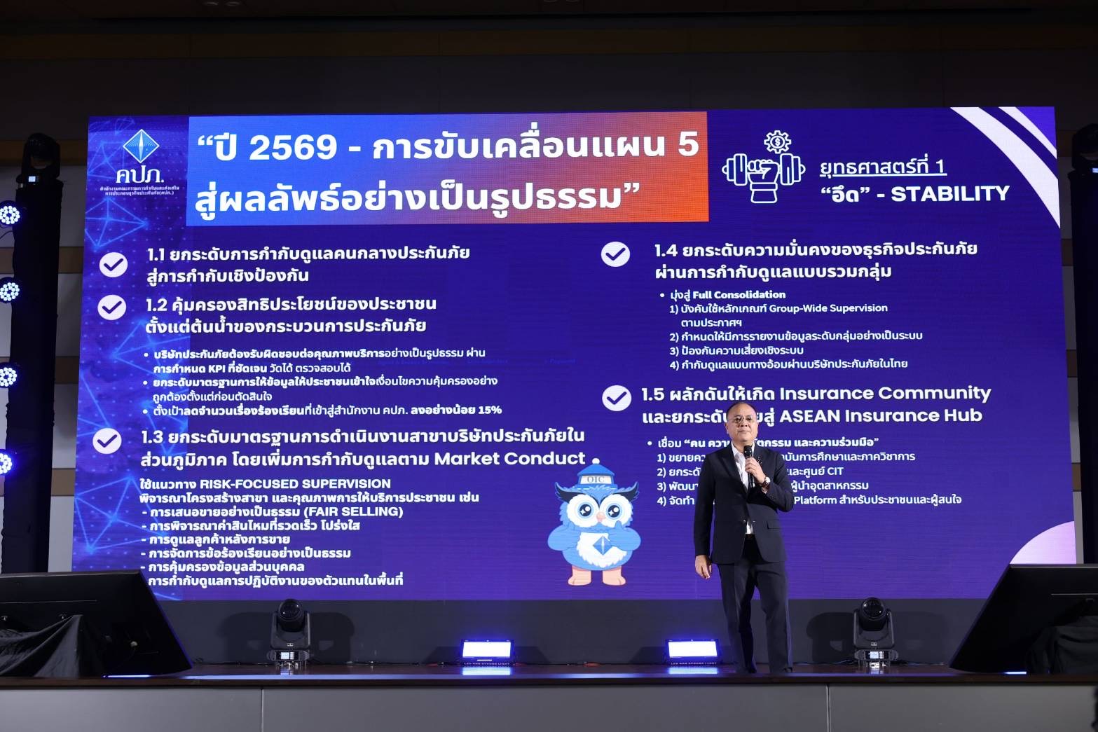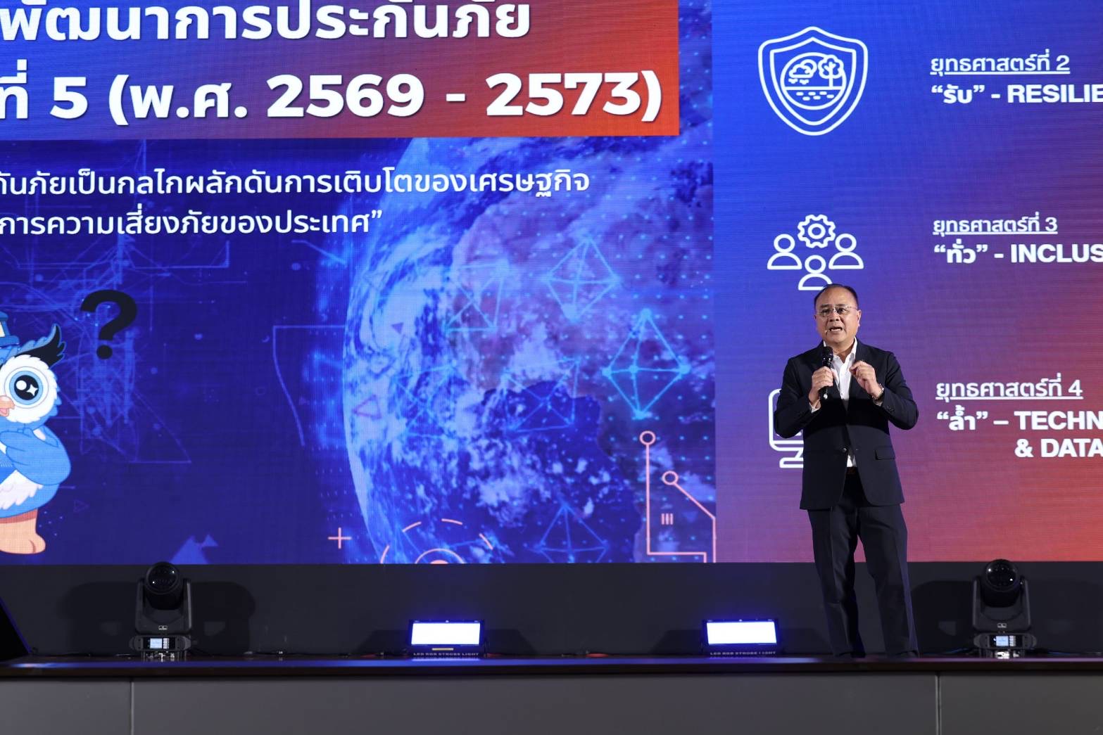เลขาธิการ คปภ. กล่าวว่า ปี 2569 ถือเป็นจุดเริ่มต้นสำคัญของการขับเคลื่อนแผนพัฒนาการประกันภัย ฉบับที่ 5 จากวิสัยทัศน์สู่การปฏิบัติจริง โดยมุ่งยกระดับระบบประกันภัยจากเครื่องมือทางเลือก สู่การเป็น “โครงสร้างพื้นฐานด้านความมั่นคงของประเทศ” และเป็น “National Risk Buffer” หรือกลไกรองรับแรงกระแทกจากความเสี่ยงที่อาจเกิดขึ้นกับเศรษฐกิจและสังคม เพื่อให้ประชาชนสามารถเข้าถึงการประกันภัยได้อย่างทั่วถึง ใช้เป็นเครื่องมือสร้างความมั่นคงในชีวิตและทรัพย์สิน และให้ระบบประกันภัยไทยสามารถรองรับความเสี่ยงใหม่และภัยพิบัติขนาดใหญ่ได้อย่างมีประสิทธิภาพ ในปี 2569 จึงเป็นปีแห่งการ “แปลงแผนสู่ผลลัพธ์ที่จับต้องได้” โดยสำนักงาน คปภ. จะดำเนินงานภายใต้ 4 ยุทธศาสตร์หลัก ซึ่งการขับเคลื่อนในปี 2569 หัวใจคือการทำให้ระบบประกันภัยไทย “อึด – รับ – ทั่ว – ล้ำ” โดยมี คน เป็นกลไกสำคัญในการขับเคลื่อนองค์กร ข้อมูล เป็นฐานในการวิเคราะห์และกำหนดนโยบาย เทคโนโลยี เป็นเครื่องมือในการยกระดับประสิทธิภาพ และ การบูรณาการ ความร่วมมือจากทุกภาคส่วน ผ่านการติดตามและการวิเคราะห์ตามบริบทธุรกิจประกันภัยอย่างสม่ำเสมอ ซึ่งการดำเนินการที่สำคัญของสำนักงาน คปภ. ประจำปี 2569 แบ่งตามหมวดยุทธศาสตร์ตามแผน 5 ดังนี้